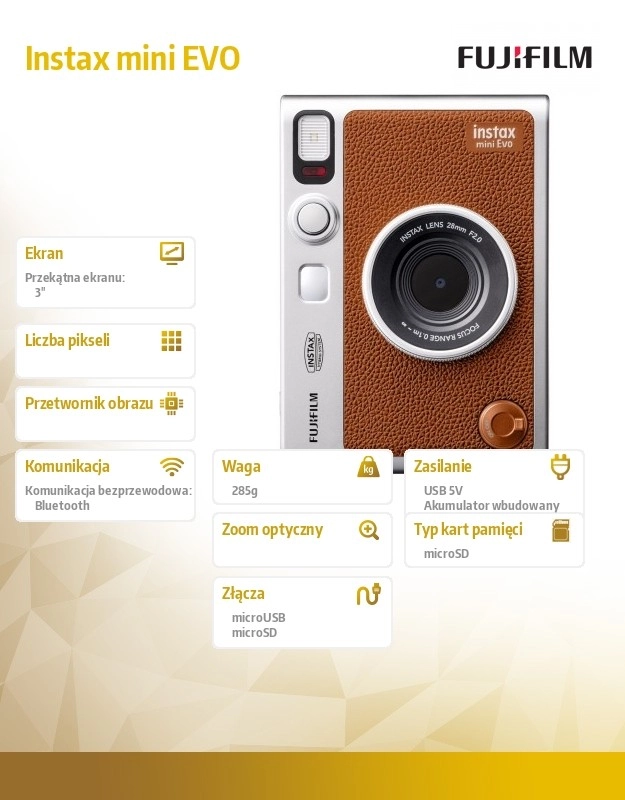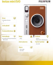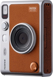 Brązowa ekoskóra, srebrne akcenty i taktyczne pokrętła nadają aparatowi Instax mini Evo niepowtarzalny wygląd i wygodny uchwyt na całodniowe fotografowanie.