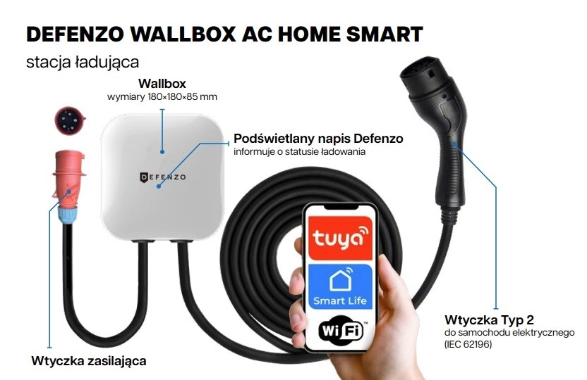 Stacja ładowania Defenzo Wallbox Home AC11 to kompaktowe i eleganckie urządzenie, które jest chronione solidną białą obudową z klasą ochrony IP54, co gwarantuje odporność na wpływy atmosferyczne i uszkodzenia mechaniczne. Dzięki aplikacjom mobilnym Tuya lub Smart Life możesz: