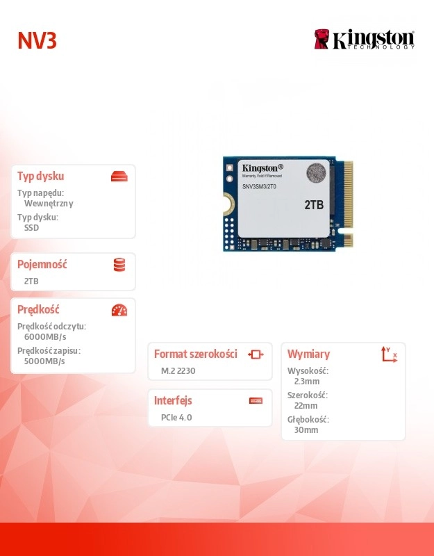 Rozszerz pamięć masową i przyspiesz system z SSD Kingston NV3 – kompaktowym rozwiązaniem M.2 2230 NVMe z interfejsem PCIe 4.0 i prędkościami do 6000/5000 MB/s. Idealny do laptopów i przenośnych konsol do gier, o niskim zużyciu energii i niskim nagrzewaniu dla stabilnej wydajności.
