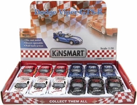 Stylowy model samochodu DODGE VIPER GTS‑R w skali 1:36 ucieszy dzieci i kolekcjonerów. Metalowo‑plastikowe wykonanie, otwierane drzwi oraz napęd z naciągiem (pull‑back) zapewniają dynamiczną jazdę. Dostępny w 4 wersjach kolorystycznych.