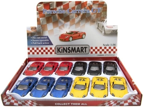 Stylowy model auta Porsche Carrera GT w skali 1:36 ucieszy małych i dużych fanów motoryzacji. Oferuje metalowe wykonanie z plastikowymi detalami, otwierane drzwi oraz napęd typu pull-back. Dostępny w czterech wariantach kolorystycznych.