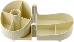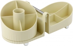 Organizer wykonany jest z wytrzymałego plastiku, który jest bezpieczny, nietoksyczny i przyjazny dla środowiska. Posiada część obrotową, która może obracać się o 360°, co zapewnia łatwy dostęp do zawartości bez konieczności przesuwania całego pojemnika. Przegrody o różnej wysokości umożliwiają przechowywanie zarówno wysokich buteleczek, jak i drobnych przedmiotów.