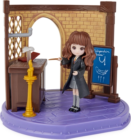 Zanurz się w świecie magii dzięki temu zestawowi, który przeniesie cię prosto do magicznej klasy. Ustaw rękę Hermiony i zobacz, jak jej różdżka sprawia, że piórko unosi się nad punktem aktywacyjnym. Dokładnie tak, piórko magicznie się wznosi! Zestaw zawiera także tablicę, księgę czarów i świeczki, które sprzyjają kreatywnej zabawie. Przeżyj ulubione sceny z Harry’ego Pottera w tej miniaturowej wersji czarodziejskiego świata. Zestaw można łączyć z innymi, takimi jak Hogwarts Magical Minis, oraz z innymi tematycznymi kompletami, aby stworzyć własny czarodziejski świat.