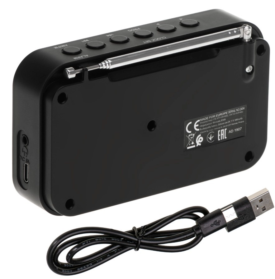 Wypróbuj zintegrowane funkcje, takie jak zegar, budzik, tryb drzemki i wyłącznik czasowy. Radio wyposażone jest w wejście słuchawkowe 3,5 mm do prywatnego słuchania i ma optymalną moc 0,6 W dla czystego i klarownego dźwięku. Z wbudowaną baterią 600 mAh radio zapewnia długotrwałe słuchanie bez konieczności ładowania. Nowoczesne zasilanie USB-C zapewnia szybkie i wygodne ładowanie.