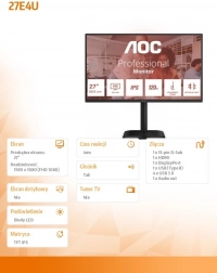 Monitor oferuje szerokie opcje łączności z portami HDMI 1.4, DisplayPort 1.2, VGA oraz wbudowanym hubem USB z czterema portami USB 3.2 (Gen 1). Zintegrowane głośniki o mocy 2 W zapewniają podstawowe wyjście dźwięku, zwiększając wygodę bez konieczności podłączania zewnętrznych głośników.