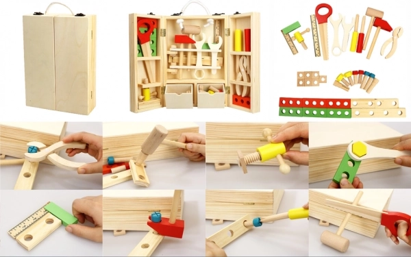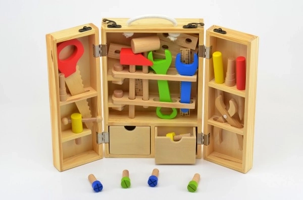 Odkryj kreatywny świat z tym drewnianym zestawem narzędzi. Idealne dla dzieci, które uwielbiają odkrywać i tworzyć.