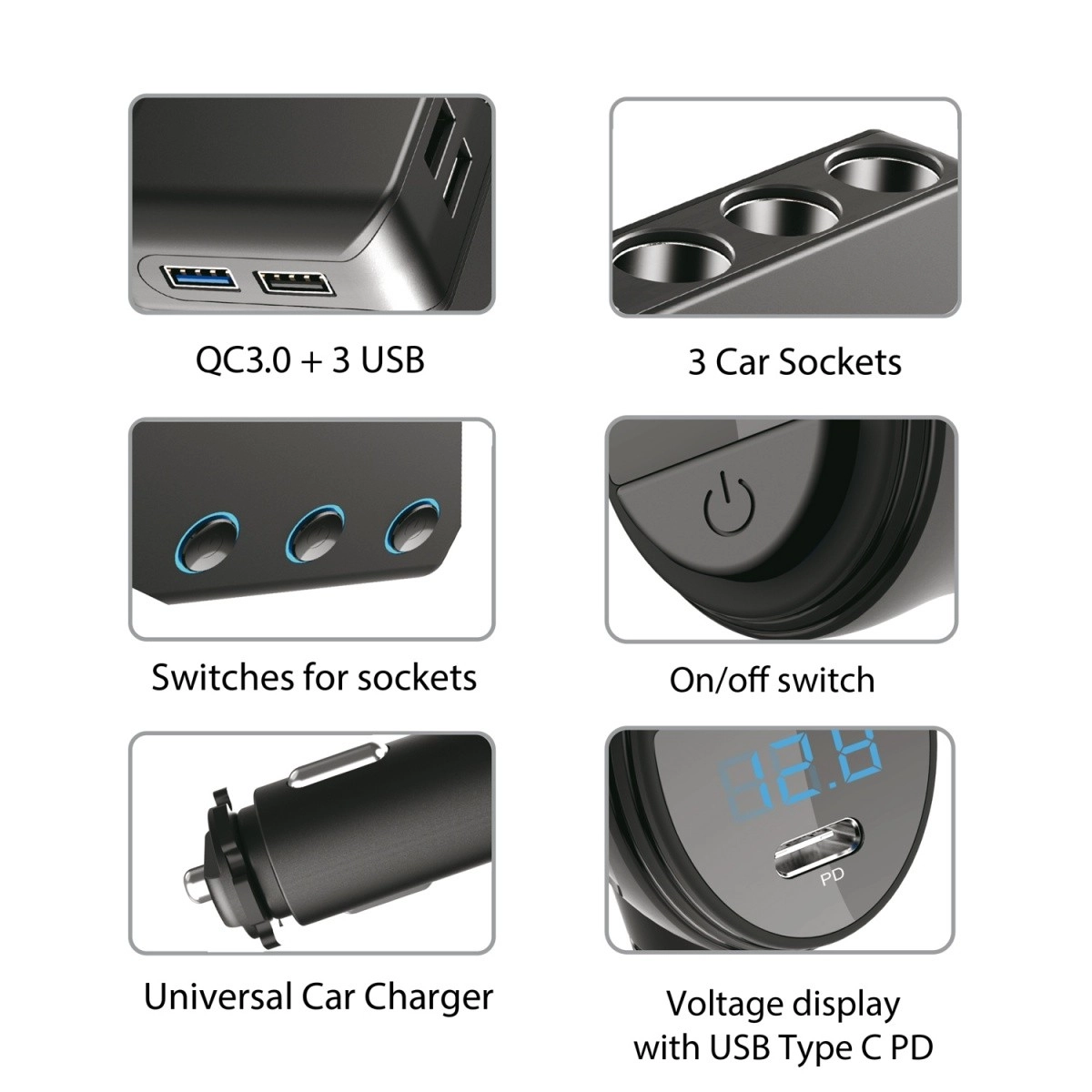 Rozdzielacz samochodowy z szybkim ładowaniem Qualcomm Quick Charge 3.0 oraz Power Delivery 18W USB-C ułatwia jednoczesne ładowanie wielu urządzeń podczas jazdy, z wbudowanym diodowym woltomierzem do kontroli napięcia akumulatora.