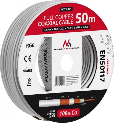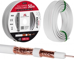 Wysokiej jakości kabel koncentryczny RG6 z litej miedzi o długości 50 metrów zapewnia doskonałe przesyłanie sygnału bez zakłóceń, nawet przy długich instalacjach.