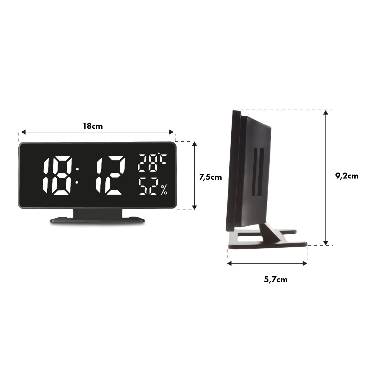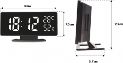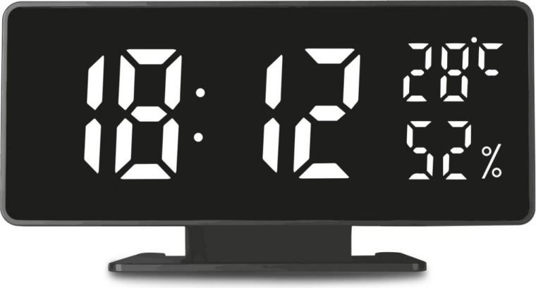 Ten budzik oferuje opcjonalny format czasu 12/24 godziny oraz pomiar temperatury w °C lub °F. Automatycznie dostosowuje się do oświetlenia w pomieszczeniu i posiada podwójny tryb wyświetlania. Bateria CR2032 podtrzymuje ustawienia pamięci podczas zaniku zasilania.