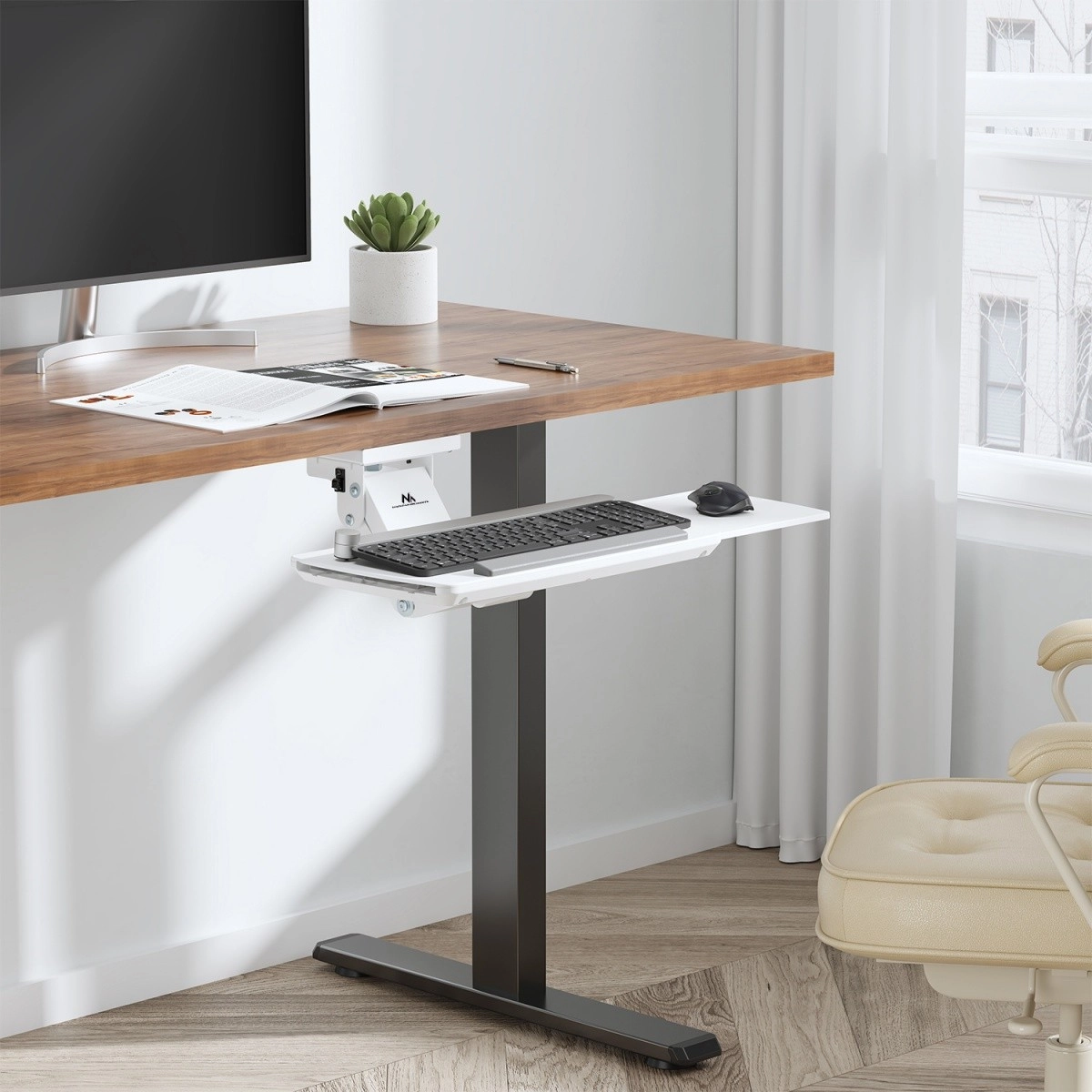 Uchwyt na klawiaturę MC-156 został zaprojektowany dla osób ceniących porządek i komfort w miejscu pracy. Montaż pod blatem pozwala na efektywne wykorzystanie przestrzeni roboczej, a solidna konstrukcja zapewnia stabilność i długą żywotność. Uchwyt może utrzymać klawiatury o wadze do 5 kg, co czyni go odpowiednim zarówno dla lżejszych, jak i cięższych modeli.