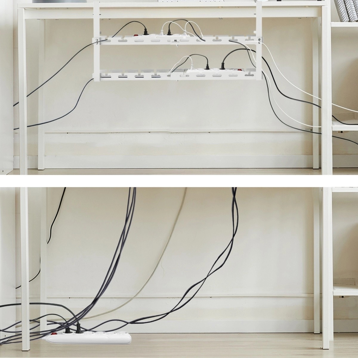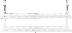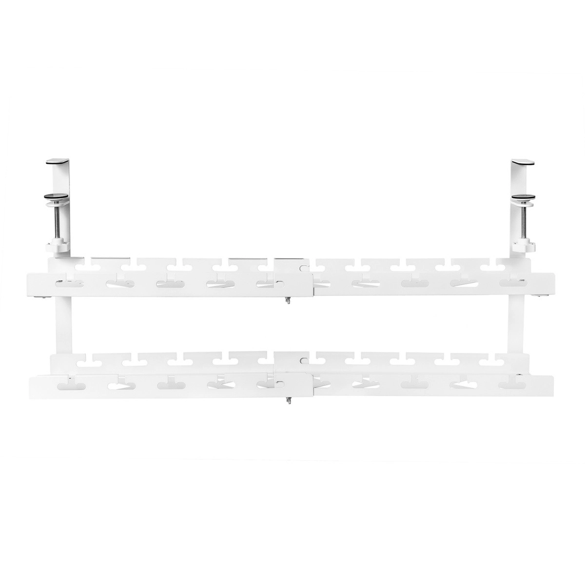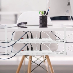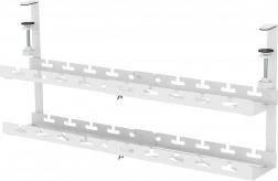 Organizer podbiurkowy ma dwa poziomy uchwytów, które umożliwiają jednoczesny montaż dwóch listew zasilających lub dodatkowych urządzeń, takich jak zasilacze, huby USB czy routery. System montażu zaciskowego pozwala na szybki i bezinwazyjny montaż bez konieczności wiercenia i naruszania powierzchni mebli.