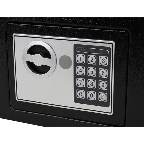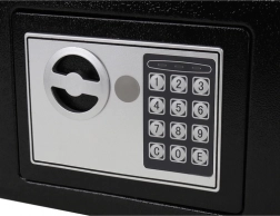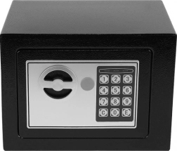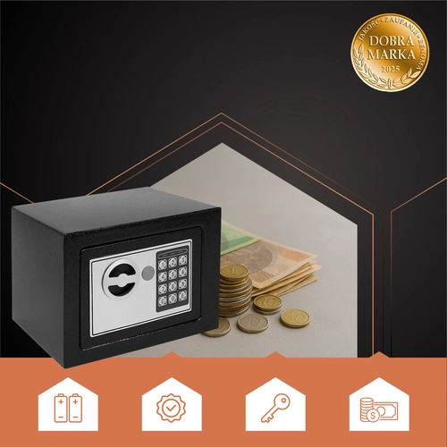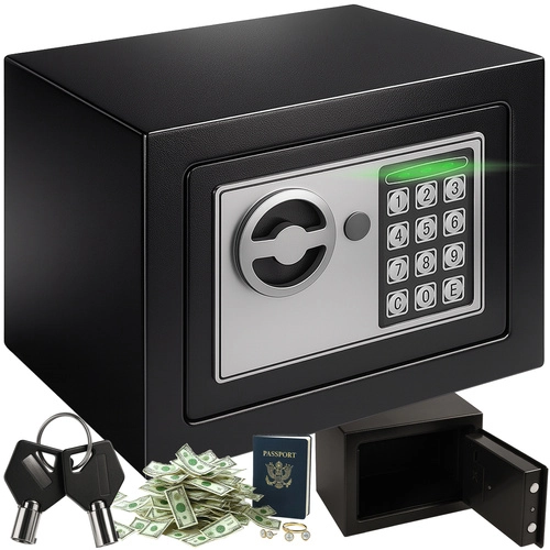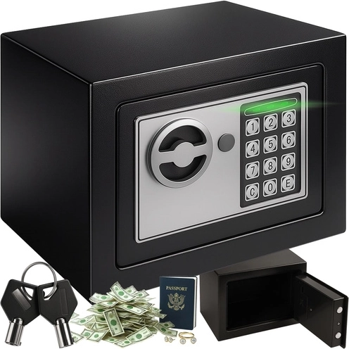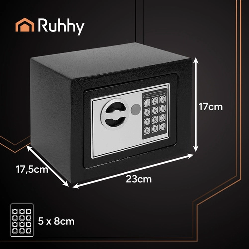 Kompaktowy sejf RUHHY chroni Twoje kosztowności dzięki elektronicznemu zamkowi szyfrowemu, automatycznej blokadzie po 3 błędnych próbach oraz awaryjnemu otwieraniu kluczem. Idealny do domu, biura i hotelu, wykonany z wytrzymałej stali, z sygnalizacją świetlną i dźwiękową oraz możliwością montażu na ścianie.