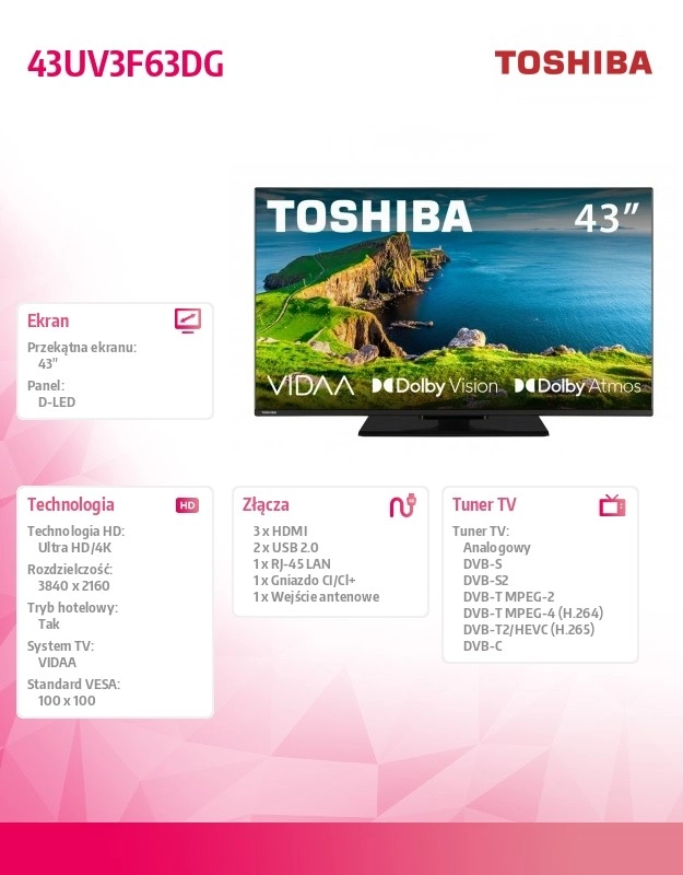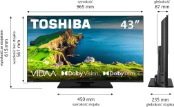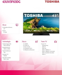 Ten 43" telewizor LED TOSHIBA to idealny wybór do salonu i sypialni. Dzięki cienkiej ramce i eleganckiej podstawie świetnie wpasuje się w nowoczesne wnętrza, a wysokiej jakości panel zapewni ostre detale i żywe kolory podczas oglądania filmów, seriali i sportu.