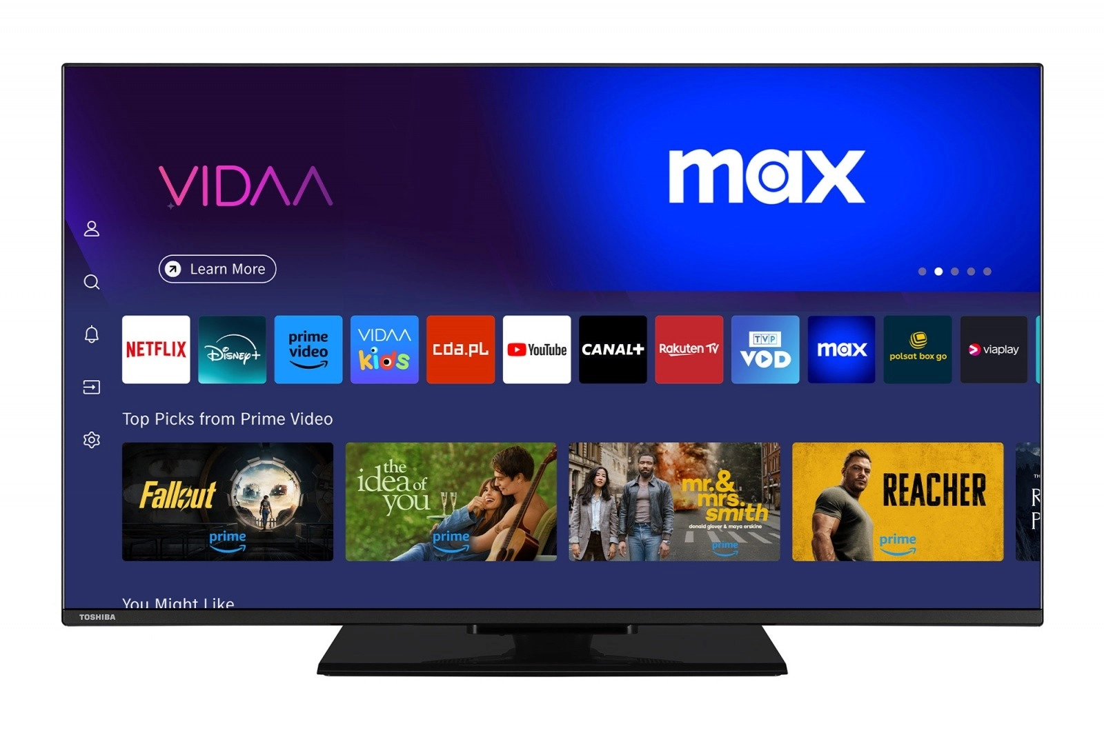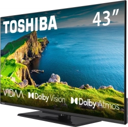 Ciesz się dużym obrazem i żywymi kolorami z 43" telewizorem LED TOSHIBA. Oferuje jasny obraz, smukły, nowoczesny design oraz łatwą obsługę dzięki przejrzystemu pilotowi z przyciskami do Netflix, YouTube i Disney+.