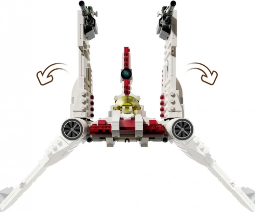 Model w biało‑czerwonej kolorystyce oferuje funkcjonalne wyrzutniki, otwierany kokpit dla pilota i świetne detale inspirowane Wojnami Klonów.