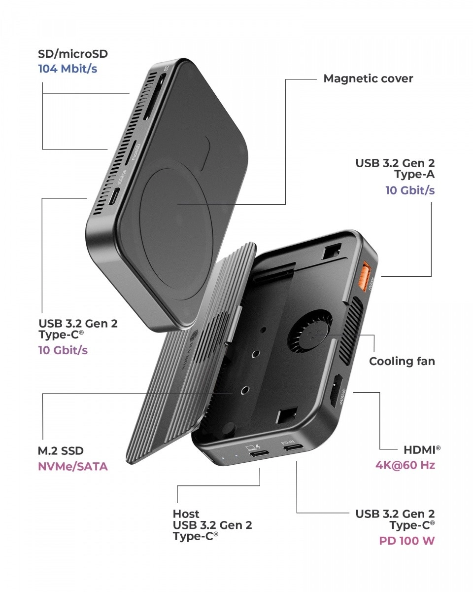 M.2 NVMe i SATA - Ta stacja dokująca łączy mocne połączenie z szybką jednostką pamięci zewnętrznej, integrującą osłonę M.2 NVMe i SATA SSD. Jest idealnym rozwiązaniem dla dużych plików, kopii zapasowych lub bibliotek multimedialnych, wszystko w jednym kompaktowym urządzeniu na biurko.