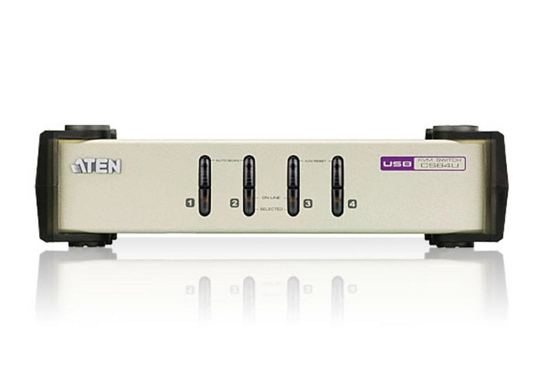 Przełącznik ATEN CS84U umożliwia wygodny dostęp do czterech komputerów z jednej konsoli KVM przez interfejsy USB i VGA. Dzięki technologii Video DynaSync optymalizuje rozdzielczość i zapewnia stabilne wyświetlanie.