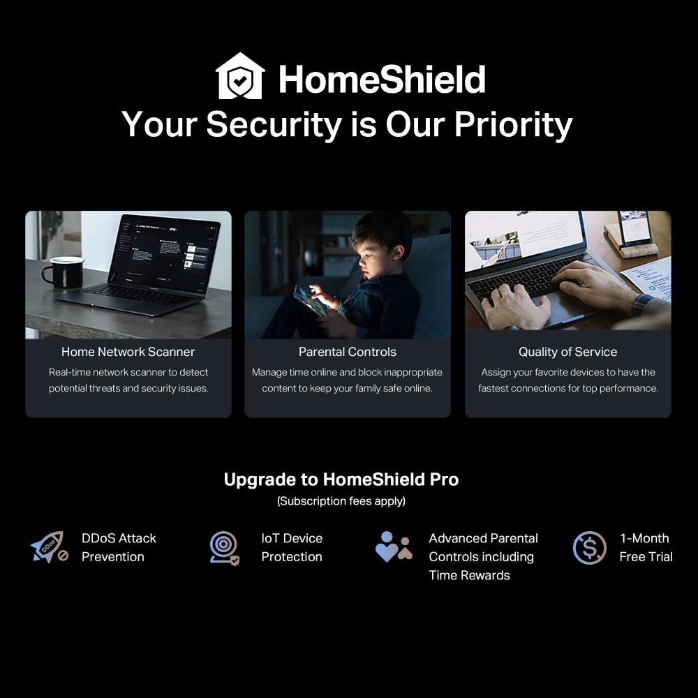 Zaawansowane funkcje bezpieczeństwa TP-Link HomeShield chronią Twoją domową sieć przed zagrożeniami cybernetycznymi.