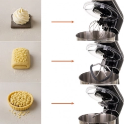- Robot, misa, hak do ciasta, trzepaczka, płaskie mieszadło, pokrywa misy, szpatułka, separator jaj, rękaw cukierniczy z 24 końcówkami w organizerze, instrukcja, materiały ochronne, kolorowe pudełko, karton transportowy