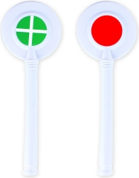 Plastikowa paletka/tarczka z wyraźnym oznaczeniem do jasnych poleceń podczas zabawy w dyżurnego ruchu.