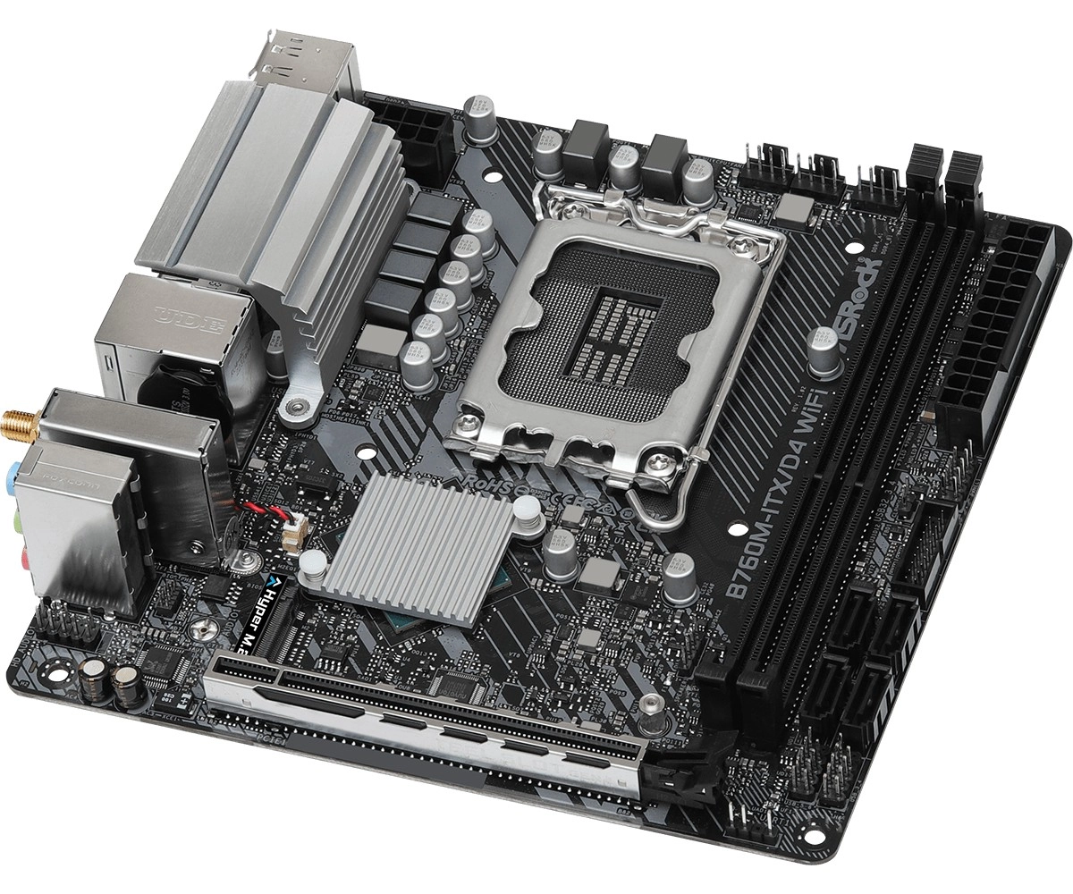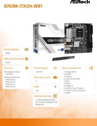 ASRock B760M-ITX/D4 WiFi to wydajna płyta mini‑ITX do budowy kompaktowych PC. Obsługuje nowoczesne procesory Intel Core (LGA1700), szybkie pamięci DDR4 do 5333+ (OC), karty graficzne przez PCIe 4.0 x16 oraz szybkie nośniki dzięki Hyper M.2 (PCIe Gen4 x4). Stabilne zasilanie zapewniają VRM 5+1+1 z Dr.MOS, wzmocnione 6‑warstwowe PCB i stalowe gniazdo PCIe.