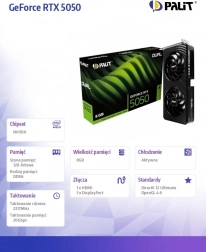 Palit GeForce RTX 5050 Dual została zaprojektowana dla graczy i twórców, którzy oczekują świetnej wydajności w kompaktowej obudowie. Dwa duże wentylatory osiowe z zoptymalizowanym przepływem powietrza utrzymują kartę w chłodzie nawet podczas długich maratonów gamingowych, a solidny metalowy backplate zwiększa wytrzymałość i poprawia estetykę. Dzięki stonowanemu podświetleniu RGB łatwo dopasujesz wygląd do swojego zestawu PC.