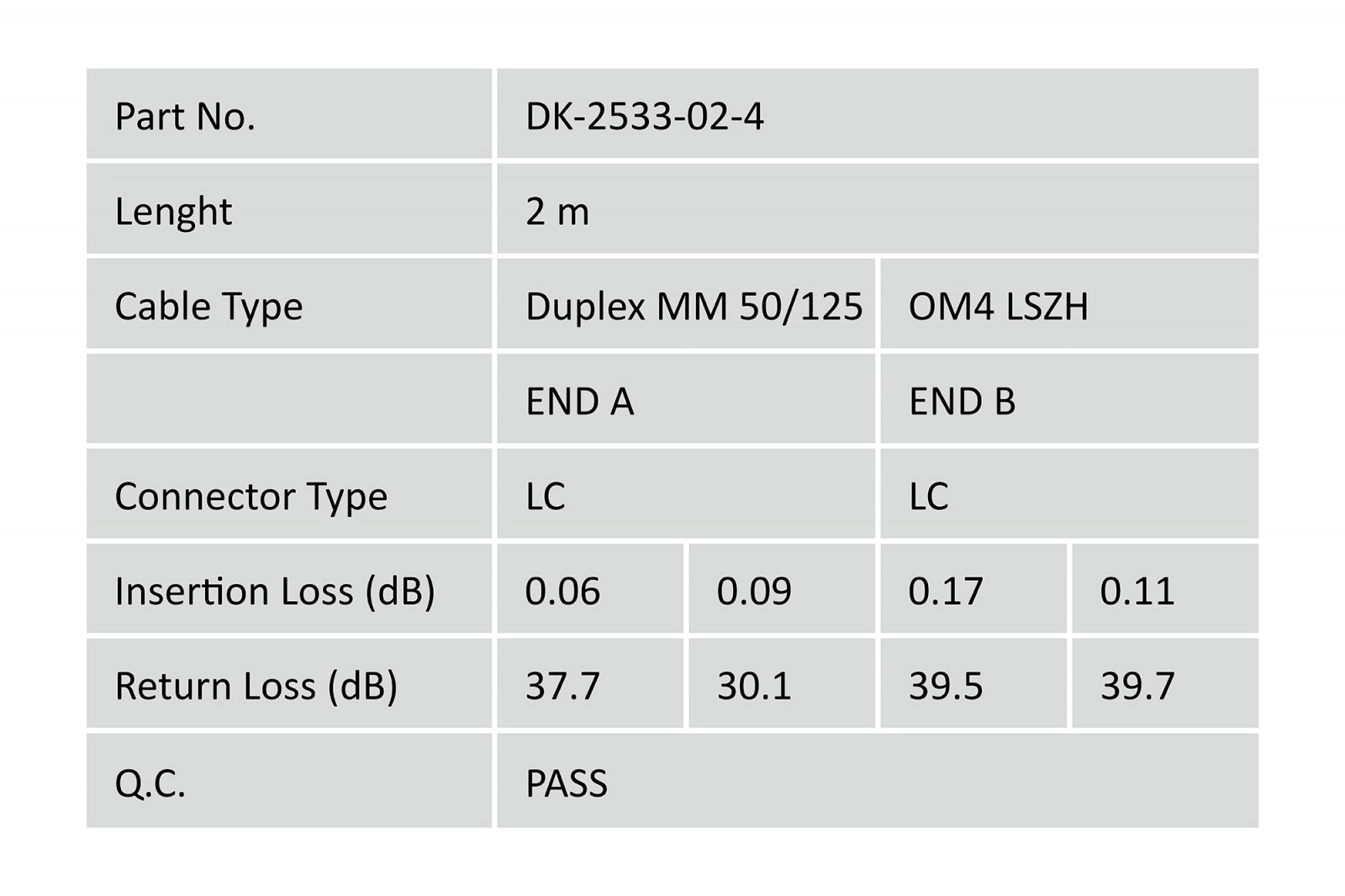 Złącza LC z ceramicznymi ferrulami gwarantują stabilne połączenie o niskim tłumieniu. Płaszcz LSOH minimalizuje dymienie i nie zawiera halogenów, co jest odpowiednie do instalacji wewnętrznych z naciskiem na bezpieczeństwo. Kabel dostarczany jest indywidualnie pakowany z protokołem pomiarowym dla pewności zgodności i jakości.
