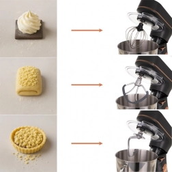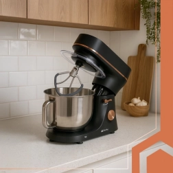 - Bogate wyposażenie: hak do ciasta, mieszadło, trzepaczka balonowa, pokrywa, szpatułka, separator do jajek, rękaw cukierniczy z 24 końcówkami w organizerze.