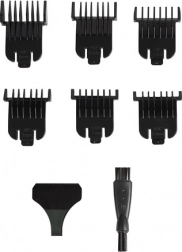 W zestawie nie brakuje 6 prowadzących grzebieni (1–9 mm), przewodu USB‑C, osłony ostrza oraz szczoteczki czyszczącej do prostej konserwacji. Urządzenie można używać bezprzewodowo i w trakcie ładowania, więc jest zawsze gotowe do pracy w domu i w barber shopie.