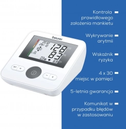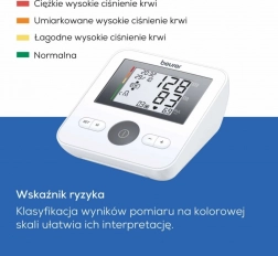 BEURER BM 27 to praktyczny naramienny ciśnieniomierz do precyzyjnych i wygodnych pomiarów w domowym zaciszu. Dzięki dużemu, łatwemu do odczytu wyświetlaczowi oraz kolorowej klasyfikacji wyników szybko ocenisz swoje wartości ciśnienia. Zintegrowana kontrola prawidłowego założenia mankietu pomaga zapewnić wiarygodne wyniki przy każdym pomiarze.