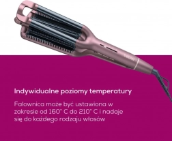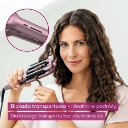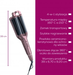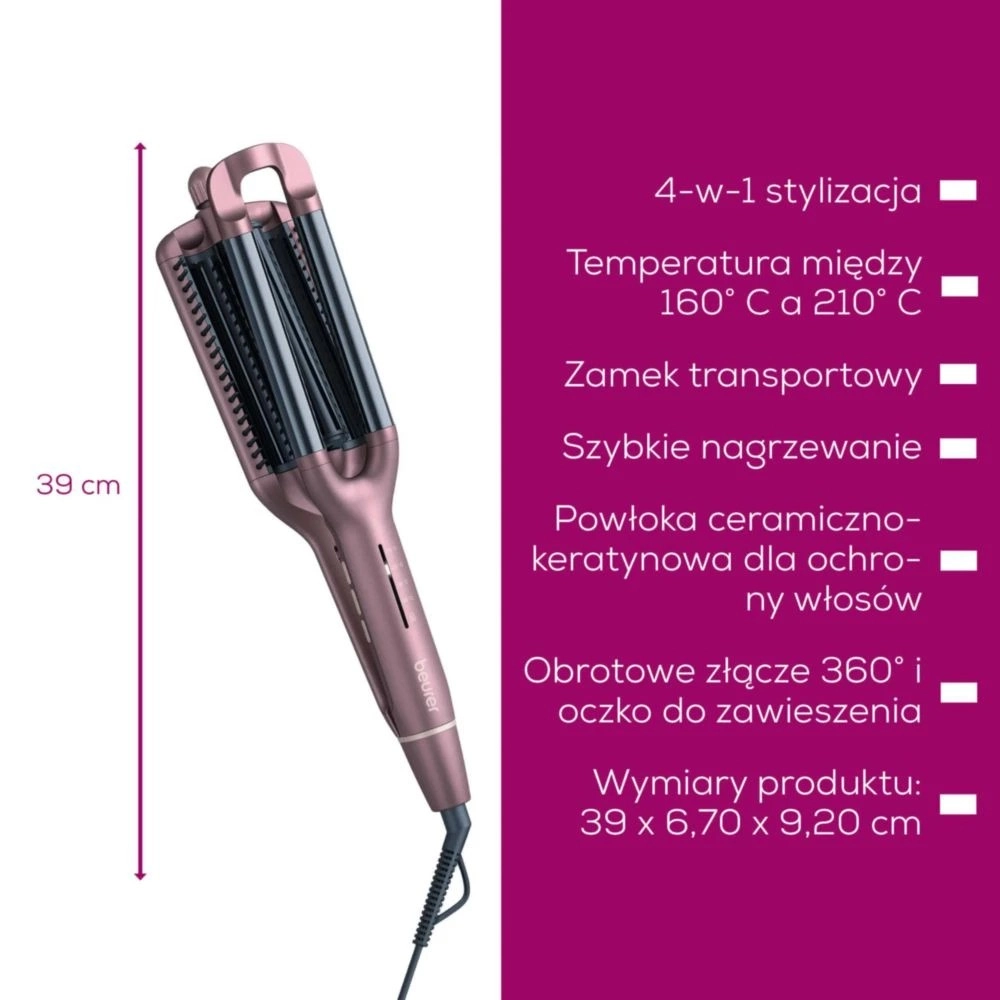 Uzyskaj w mgnieniu oka perfekcyjne fale dzięki falownicy BEURER HT65 4w1. Stworzysz Beach Waves, naturalne fale, Mermaid Waves oraz fale wodne. Dla ochrony włosów powierzchnia została wykończona powłoką ceramiczno-keratynową. Ucieszy także szybkie nagrzewanie, 4 ustawienia temperatury i obrotowy przegub 360°, który zapobiega skręcaniu kabla.