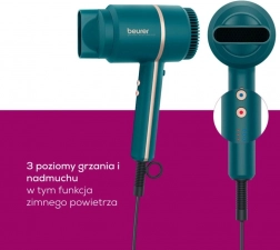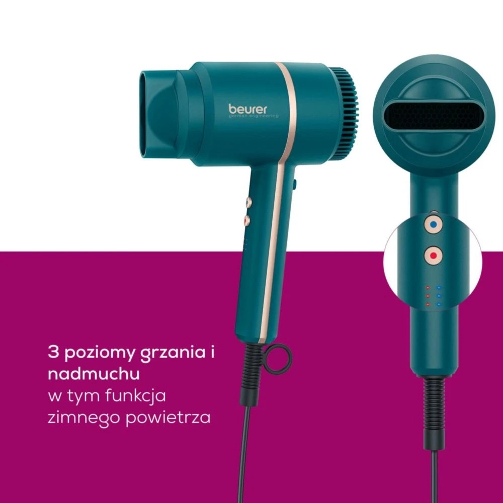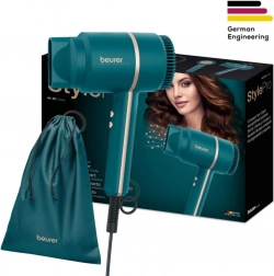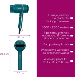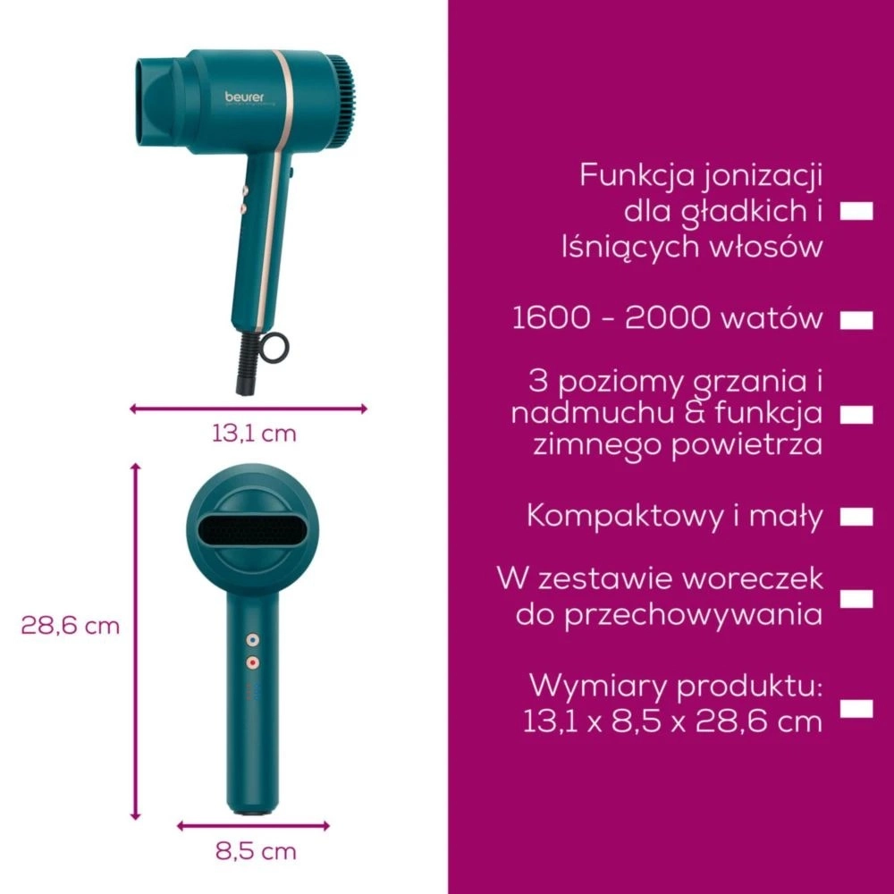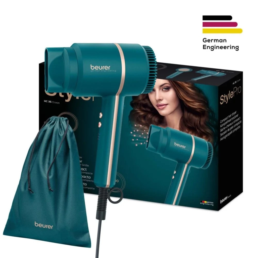 Beurer HC 35 Ocean to praktyczna mała suszarka, która łączy nowoczesny design z wysoką wydajnością. Dzięki kompaktowym wymiarom i dołączonemu woreczkowi do przechowywania idealnie sprawdzi się w łazience i w podróży. Zintegrowana jonizacja zmniejsza puszenie, dodaje włosom blasku i ułatwia ich układanie.