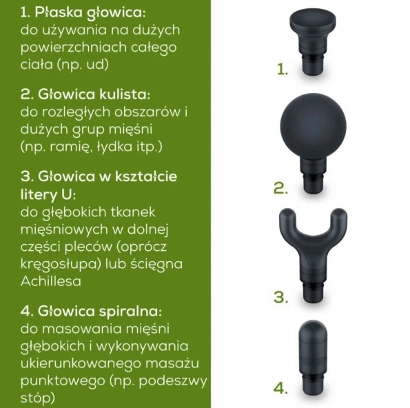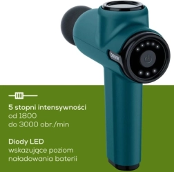Dzięki 4 wymiennym końcówkom i 5 poziomom intensywności dopasujesz masaż dokładnie do swoich potrzeb – od karku i pleców po ramiona i nogi. Ergonomiczny uchwyt zapewnia wygodne trzymanie, a wskaźnik LED czytelnie pokazuje stan baterii.