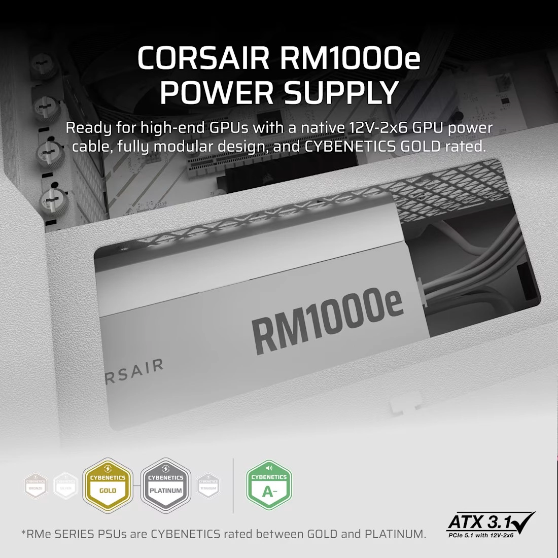 Corsair RM1000e White został zaprojektowany z myślą o wymagających komputerach do gier i pracy, gdzie liczą się stabilność, cisza i efektywność. Dzięki nowoczesnym standardom ATX 3.1 i PCIe 5.1 łatwo zasila wydajne karty graficzne i procesory, a certyfikat Cybenetics Gold gwarantuje wysoką sprawność i kulturalną pracę.