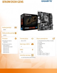 Płyta główna Gigabyte B760M DS3H GEN5 dla gniazda LGA1700 oferuje PCIe 5.0, szybką sieć 2.5GbE LAN, 4 sloty DDR5 z XMP, dwa gniazda M.2 PCIe 4.0 dla błyskawicznych SSD oraz nowoczesną łączność USB‑C 10 Gb/s, DisplayPort, HDMI i D‑Sub. Wytrzymała konstrukcja Ultra Durable, hybrydowe VRM 6+2+1, inteligentne chłodzenie Smart Fan 6 oraz funkcja Q‑Flash Plus do aktualizacji BIOS‑u bez CPU zapewniają stabilną wydajność i łatwy montaż.