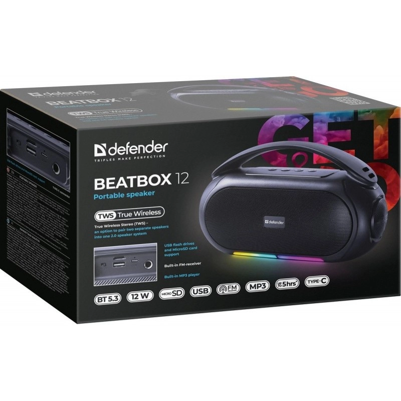 Ciesz się mocnym dźwiękiem wszędzie dzięki przenośnemu głośnikowi Beatbox 12. Oferuje moc 16 W, nowoczesny Bluetooth 5.3, efektowne podświetlenie LED, wbudowany odtwarzacz MP3 oraz tuner FM. Obsługuje pamięci USB i karty microSD dla łatwego odtwarzania muzyki bez telefonu.