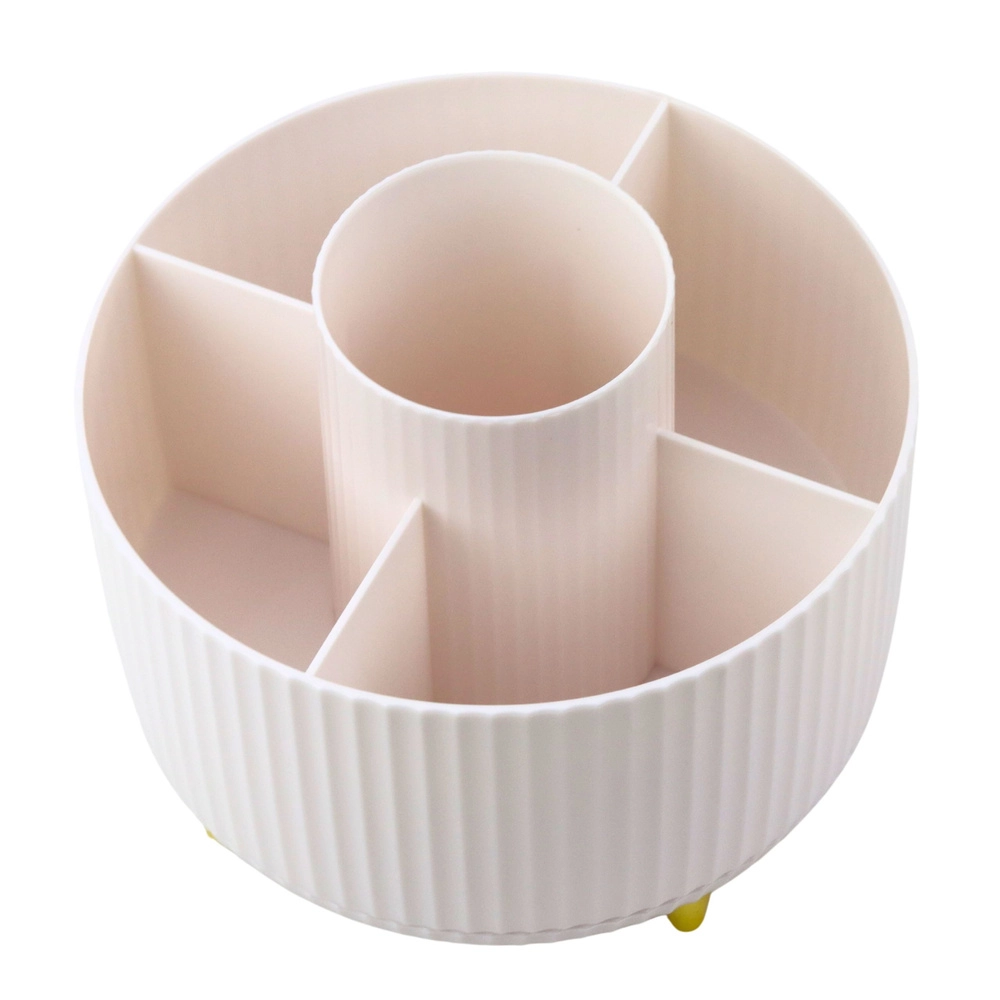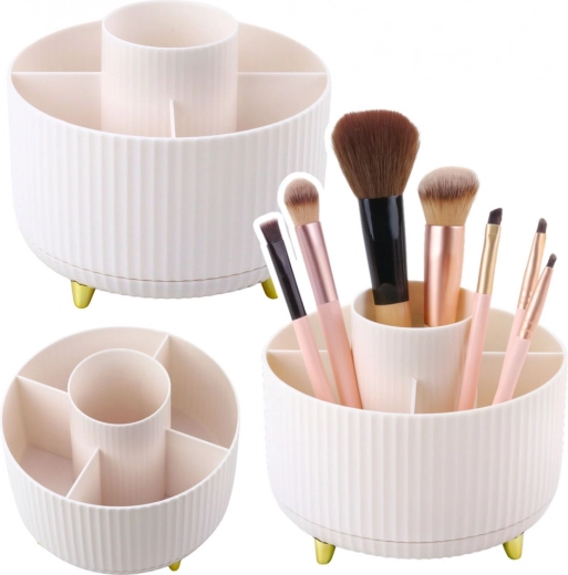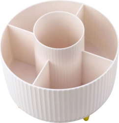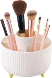 Stylowy i praktyczny organizer na kosmetyki z obrotową podstawą 360° pomoże utrzymać idealny porządek. Oferuje 5 przestronnych przegródek na pędzle, pomadki, kredki i inne akcesoria. Wykonany z wytrzymałego ABS, ma stabilną konstrukcję oraz otwartą formę dla łatwego dostępu także do dłuższych pędzli.