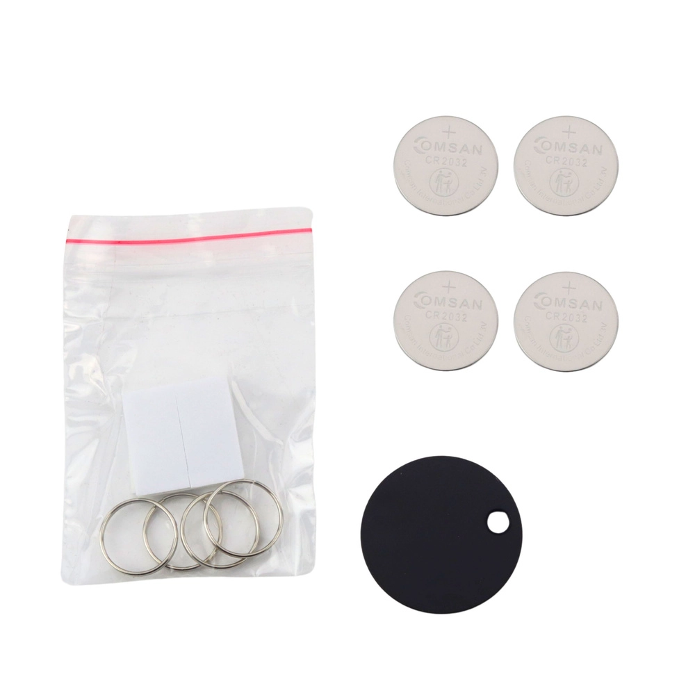 - 1× nadajnik z latarką LED, 4× odbiornik (różne kolory), 1× podstawka, 4× dwustronna taśma, 4× kółko do kluczy, instrukcja