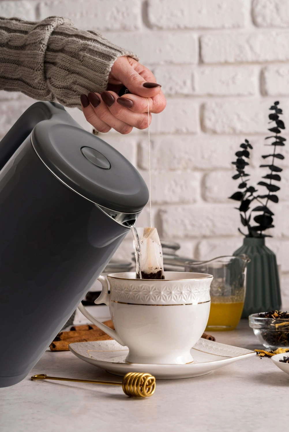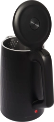 Przemyślane detale ułatwiają codzienne użytkowanie: przycisk otwierania pokrywy w uchwycie umożliwia wygodną obsługę jedną ręką, kontrolka świetlna sygnalizuje pracę, wewnętrzny wskaźnik poziomu pomaga precyzyjnie dozować wodę, a obrotowa podstawa 360° pozwala odstawić czajnik z dowolnego kierunku. Oczywiście jest automatyczne wyłączanie po zagotowaniu oraz ochrona przed pracą na sucho dla maksymalnego bezpieczeństwa.