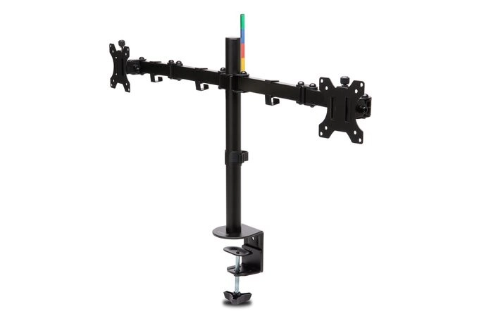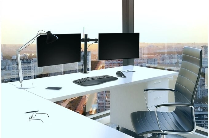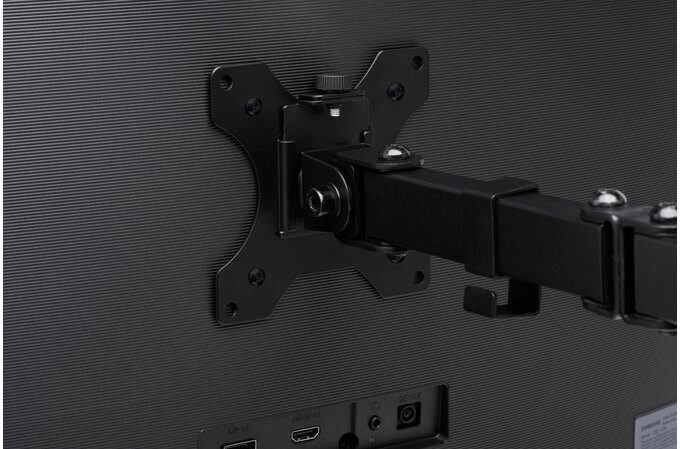 Wytrzymała stalowo-aluminiowa konstrukcja mocowana jest do krawędzi biurka za pomocą klamry typu C lub przepustu, co oszczędza miejsce i nie rysuje blatu. Każde ramię utrzyma monitor do 32" i 8 kg, oferując płynną i precyzyjną regulację idealną do każdego środowiska pracy.