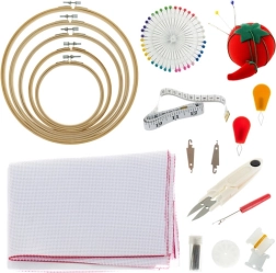 - Torba do przechowywania; 5× bambusowy tamborek; 3× tkanina do haftowania; 100× mulina; naparstek; 2× nawlekacz do igieł; blok wosku; miara krawiecka; nożyczki; prujka; 5× wkład do długopisu; etui na długopis; woreczek na igielnik; igła do haftu ze złotym uchem; 10× szpulka; 2× nawlekacz; 2× papier rozpuszczalny w wodzie; kolorowe opakowanie