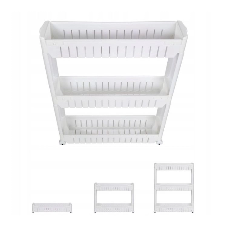 Dzięki 3 wytrzymałym i pojemnym półkom łatwo przechowasz środki czystości, kosmetyki i akcesoria łazienkowe, a w kuchni przyprawy, płatki śniadaniowe czy przekąski. Modułowa konstrukcja pozwala w razie potrzeby dodawać lub usuwać półki, dzięki czemu dopasujesz wnętrze dokładnie do swoich rzeczy. 4 płynnie toczące się kółka zapewniają łatwe manewrowanie nawet w wąskich przejściach.
