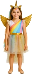 Ten czarujący kostium jednorożca zachwyci wszystkie małe miłośniczki fantazji. Zestaw zawiera wszystko, co potrzebne do natychmiastowego przebrania – sukienkę z błyszczącym tiulem, złote skrzydła na gumkach oraz opaskę z rogiem i uszkami. Dzięki uniwersalnemu zastosowaniu to doskonały wybór na cały rok – od szkolnych występów po imprezy tematyczne.
