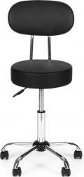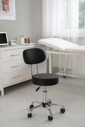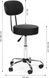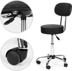 Profesjonalny obrotowy stołek z oparciem do salonów kosmetycznych, fryzjerskich i placówek medycznych. Oferuje płynną regulację wysokości, obrotowe siedzisko 360°, stabilną metalową konstrukcję oraz trwałą tapicerkę z ekoskóry PVC. Dzięki miękkiej piance 8 cm, pięcioramiennej podstawie na kółkach i udźwigowi 136 kg zapewnia wygodę, mobilność i długą żywotność.