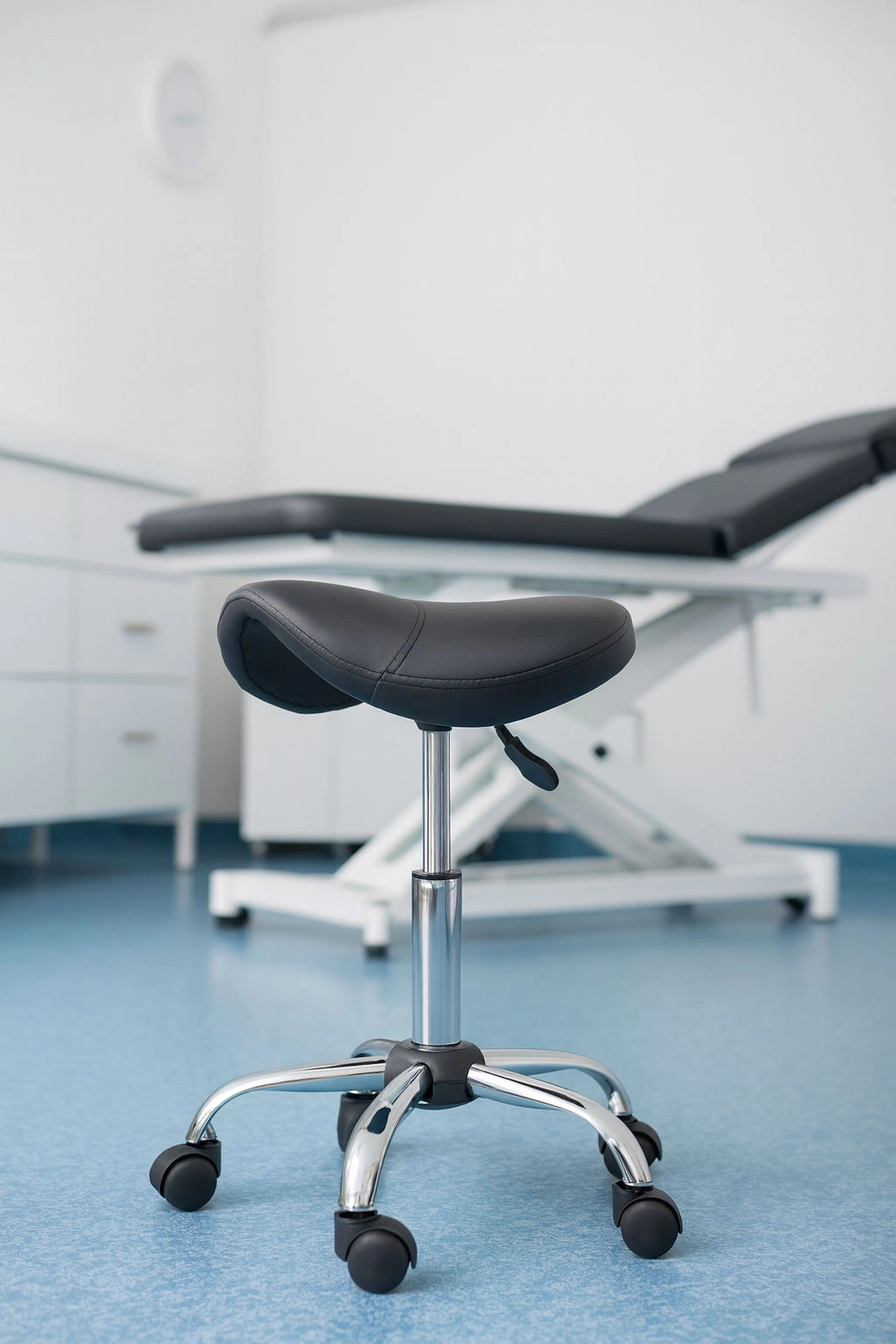 Trwałe materiały do pracy profesjonalnej. Tapicerka z ekoskóry PVC jest łatwa w czyszczeniu i odporna na wodę, olejki do masażu oraz środki dezynfekujące. Metalowa (chromowana) podstawa gwarantuje długą żywotność i niezawodność w codziennym użytkowaniu.