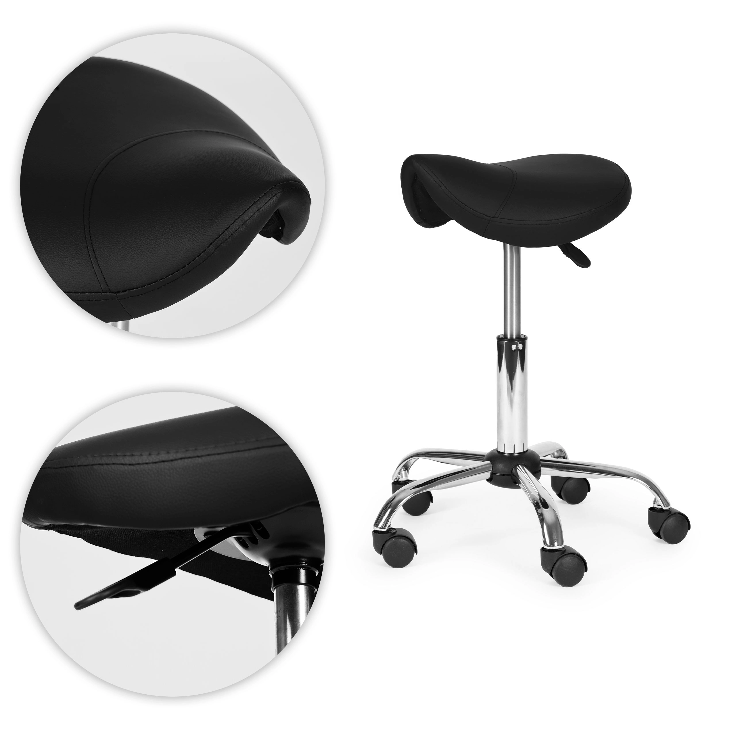 Profesjonalne obrotowe krzesło z siedziskiem typu siodło do salonów urody, fryzjerskich i gabinetów. Oferuje ergonomiczny kształt, płynną regulację wysokości, 360° obrotowe siedzisko oraz stabilną pięcioramienną podstawę na kółkach. Wytrzymała tapicerka z PVC, metalowa konstrukcja i maksymalne obciążenie 150 kg zapewniają długą żywotność i wygodę podczas pracy.