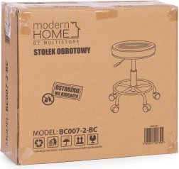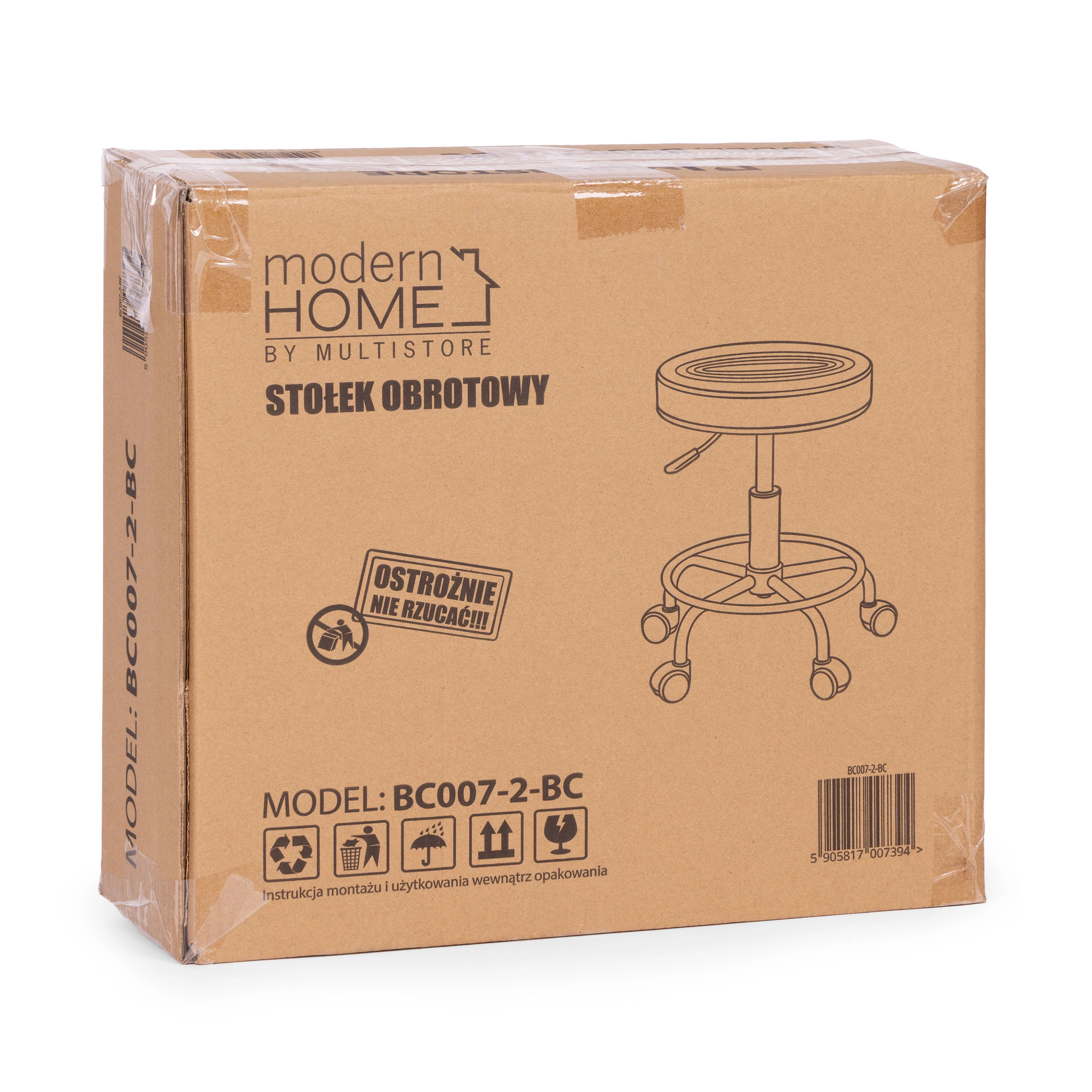Praktyczny obrotowy stołek z oparciem od ModernHome do salonów kosmetycznych, fryzjerskich oraz gabinetów. Oferuje płynną regulację wysokości za pomocą siłownika pneumatycznego, obrotowe siedzisko 360°, stabilną pięcioramienną podstawę z kółkami oraz tapicerkę z wytrzymałej skóry PVC. Komfort zapewnia pianka o grubości 5 cm oraz cichy, płynny ruch bez rysowania podłogi.