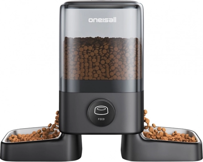 ONEISALL PF09 to praktyczny podajnik karmy zaprojektowany dla domów z dwoma zwierzętami. Duża pojemność 5 l (ok. 2,3 kg karmy) wystarcza na około 10 dni dla 2 kotów, przezroczysty zasobnik ułatwia kontrolę stanu, a przemyślane podwójne miski oddalone o 40 cm ograniczają stres i współzawodnictwo podczas posiłku.
