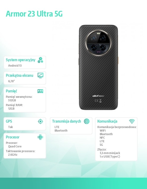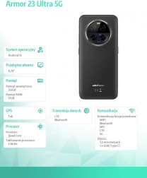 ULEFONE Armor 23 Ultra 5G to niezawodny telefon outdoorowy, który łączy wysoką wydajność, wytrzymałą konstrukcję i zaawansowany system fotograficzny w eleganckiej, czarnej odsłonie. Został zaprojektowany dla użytkowników oczekujących urządzenia, które bez kompromisów poradzi sobie z pracą, rozrywką i przygodą.