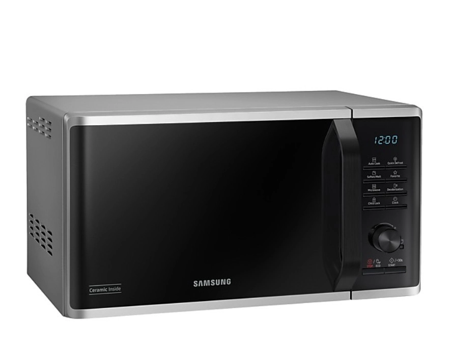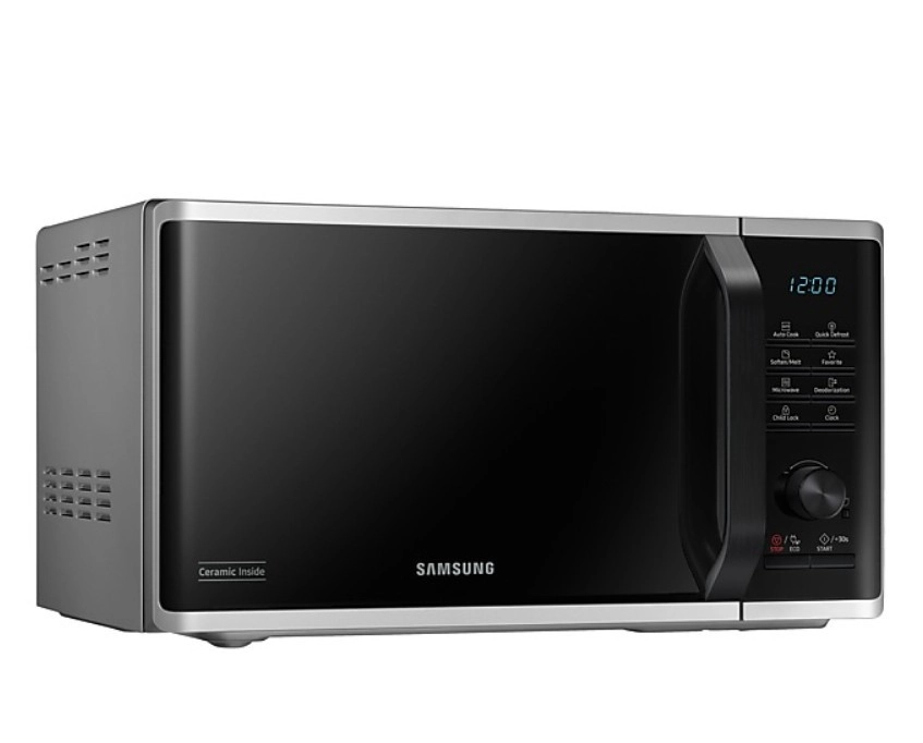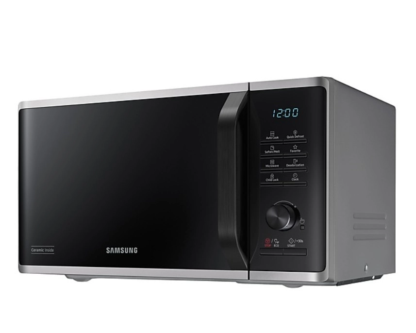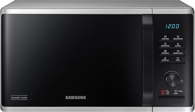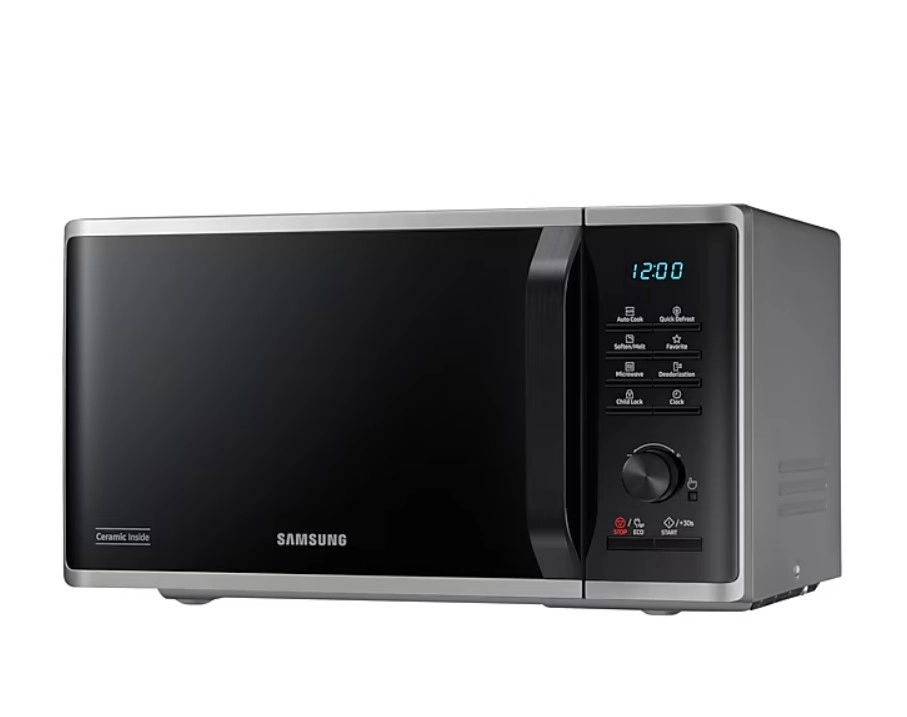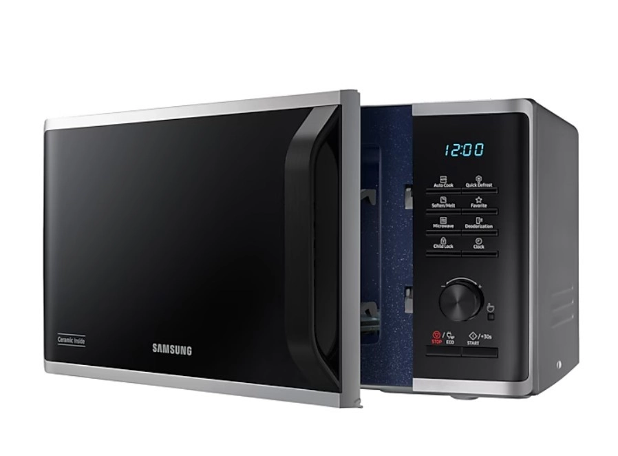 Stylowa kuchenka mikrofalowa SAMSUNG MS23K3515AS oferuje szybkie i równomierne rozmrażanie, trwałą ceramiczną powłokę wnętrza dla łatwego czyszczenia oraz deodoryzację dla świeższego zapachu w środku. Dzięki oszczędnemu trybowi ECO zmniejszysz zużycie energii, a Auto Menu i funkcje roztapiania masła i czekolady ułatwią gotowanie i pieczenie bez przypalania.